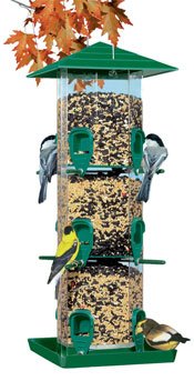 This bird feeder is the only one I have found that allows seed to remain in every feeding level because of the separated sections and tunnel design for the seed fill. This design allows 12 feeding stations to remain in use. The small tray also gives Cardinals the footing they enjoy when feeding. This would rate five stars except for the ports being plastic instead of metal, so if squirrels can get to the feeder, they are able to destroy the ports. That won't stop me from buying this feeder as the separate levels allow so many birds to feed, but metal ports would make it perfect.